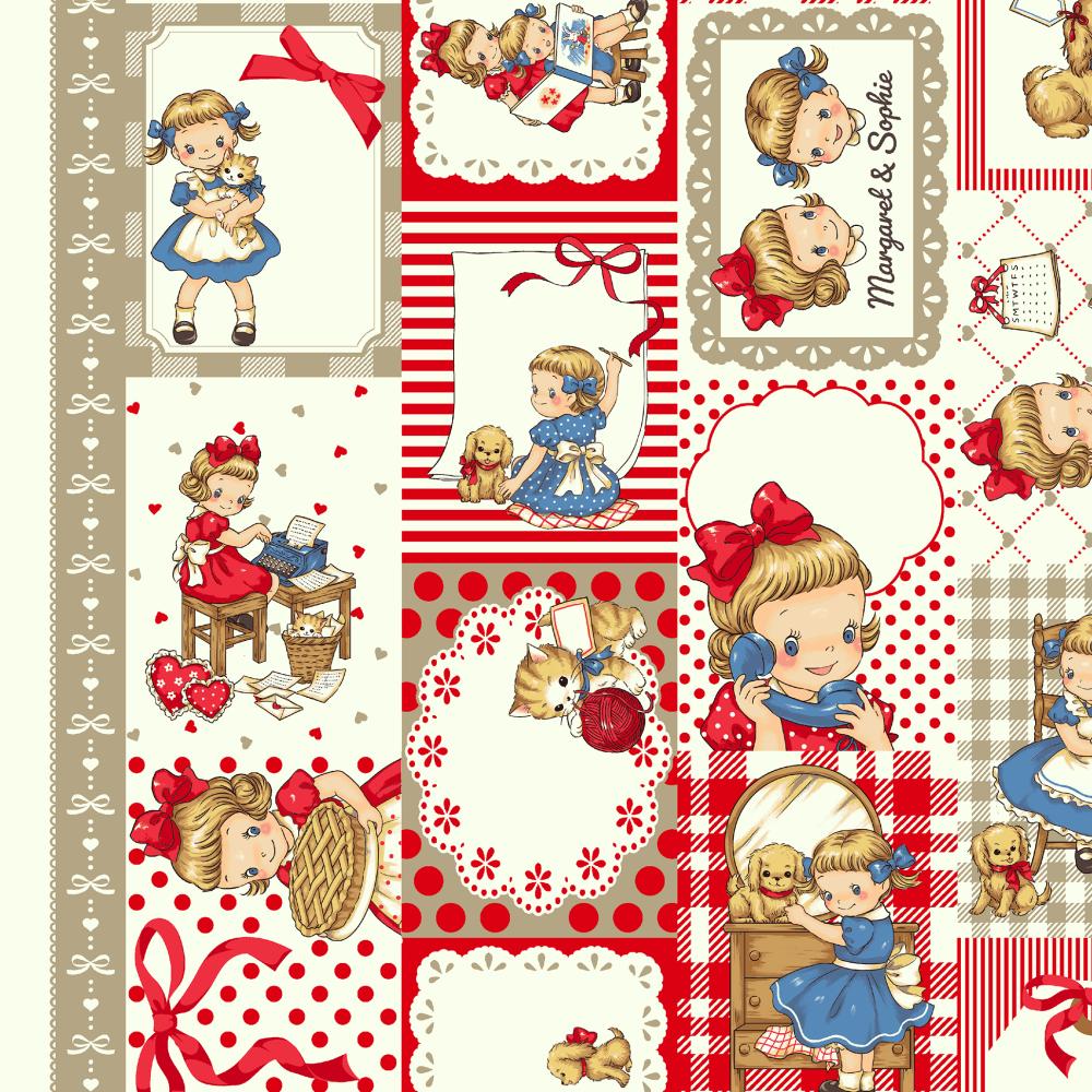 100% quilting weight cotton. 43" wide. 12" repeat. The sweetest print of Margaret & Sophie writing letters, chatting, baking cherry pies!