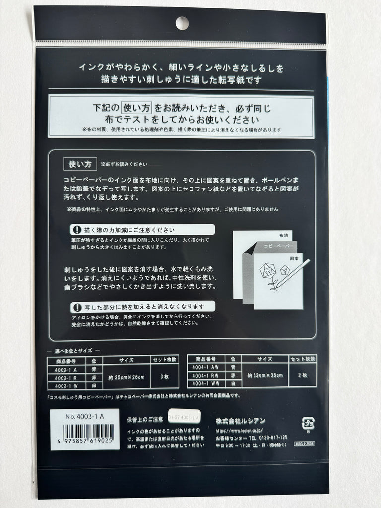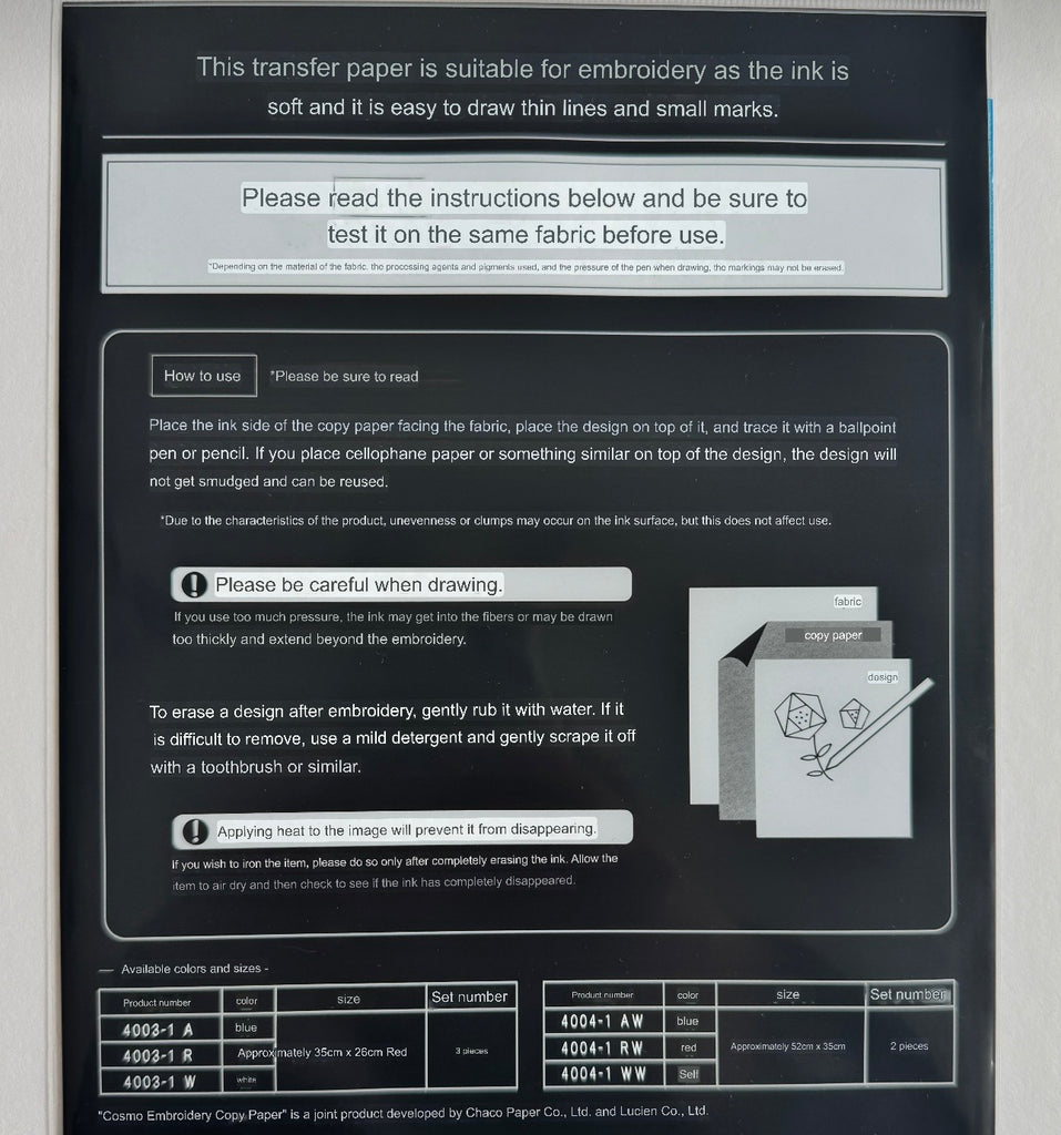 Place the ink side of the paper down on the right side of your fabric. Place your pattern to transfer on top of the transfer paper (wrong side). If you want to keep the pattern paper clean from marks, place cellophane or tissue paper on top of the pattern (optional). Trace your pattern with a pencil. Carefully, lift all papers off of the fabric and you will see the transfer of your embroidery pattern onto the fabric. The transfer paper can be reused. To remove marks on fabric, gently rub with water. Heat from an iron will set the marks and they cannot be removed. The packaging is in Japanese; use a translator app to translate the instructions.