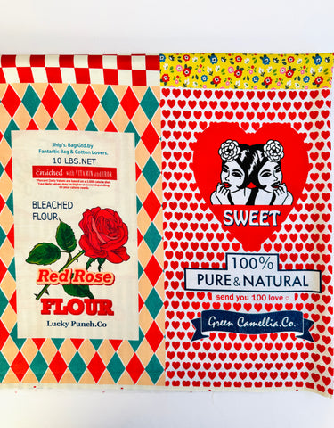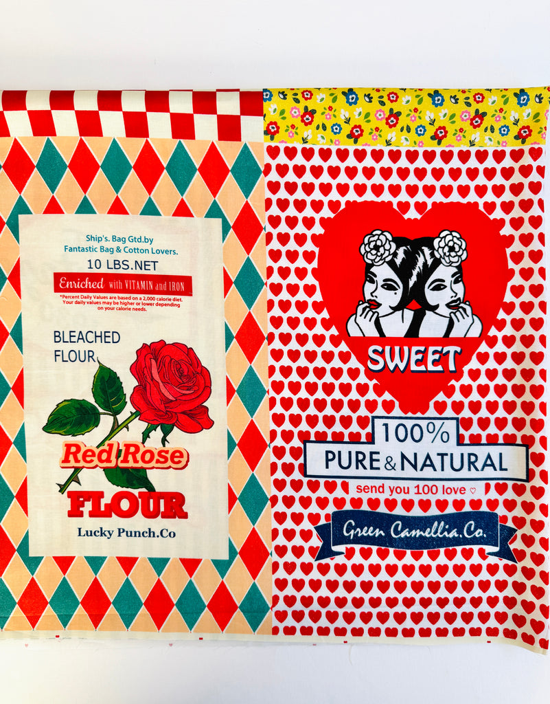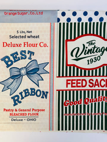 The larger “feedsack” sections measure about 10.75” wide by 18.25” long. The labels measure about 2.5” wide and 4” long.